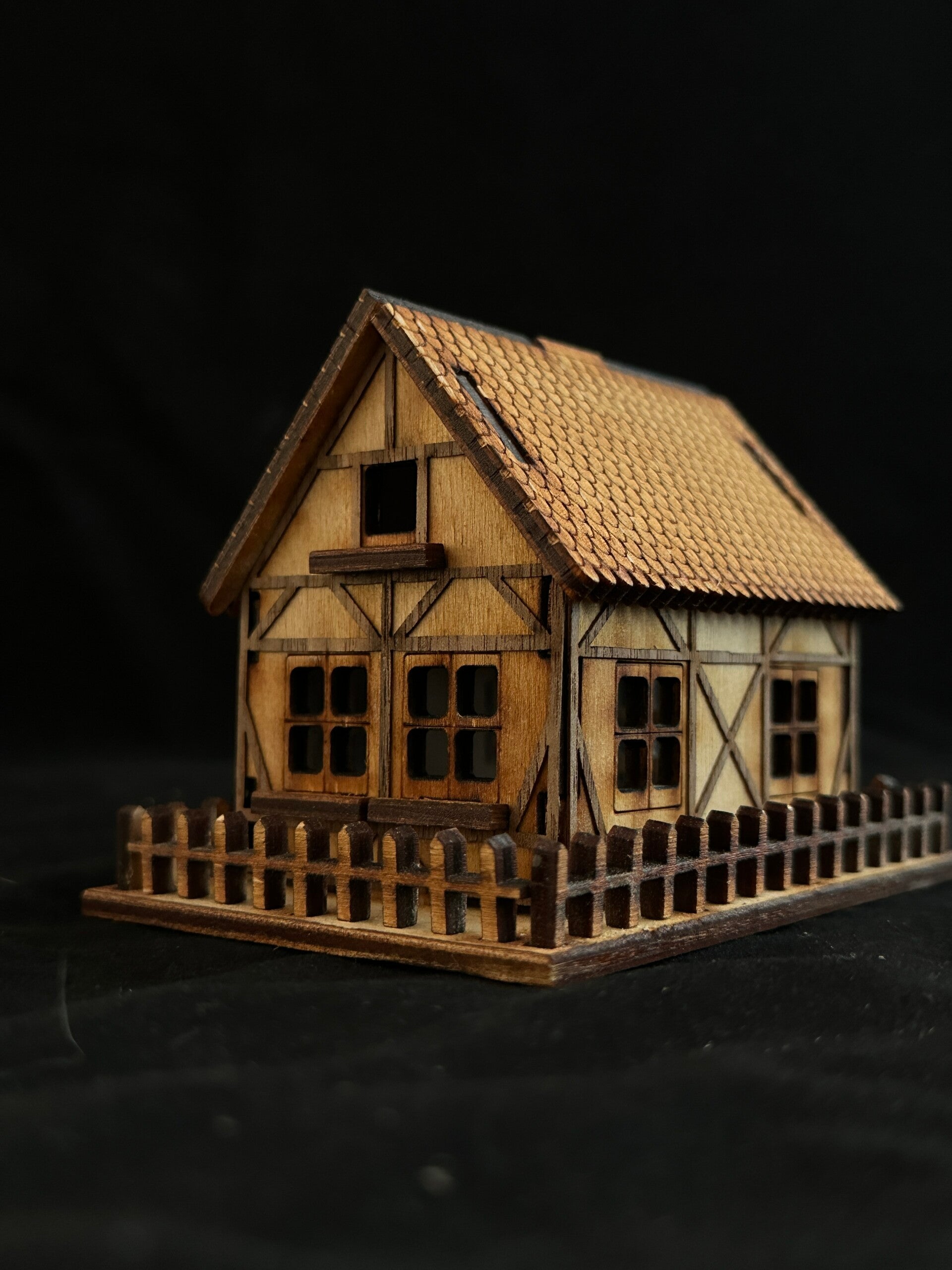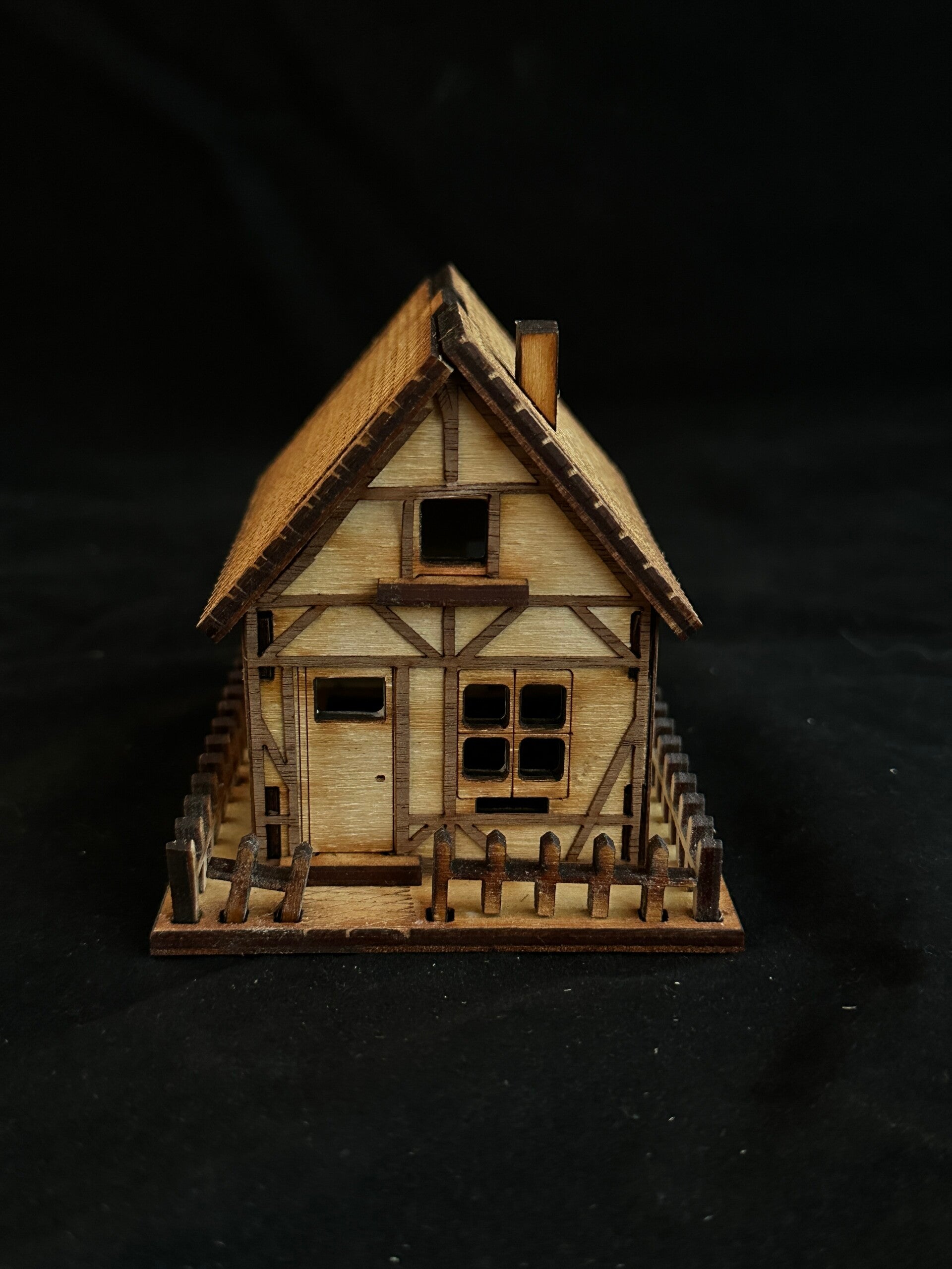 Das Haus ist mit echtem Fachwerk aus Furnierholz gefertigt.